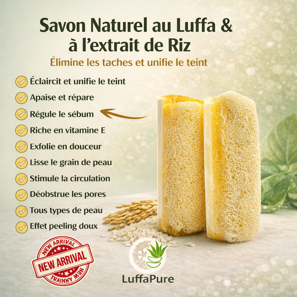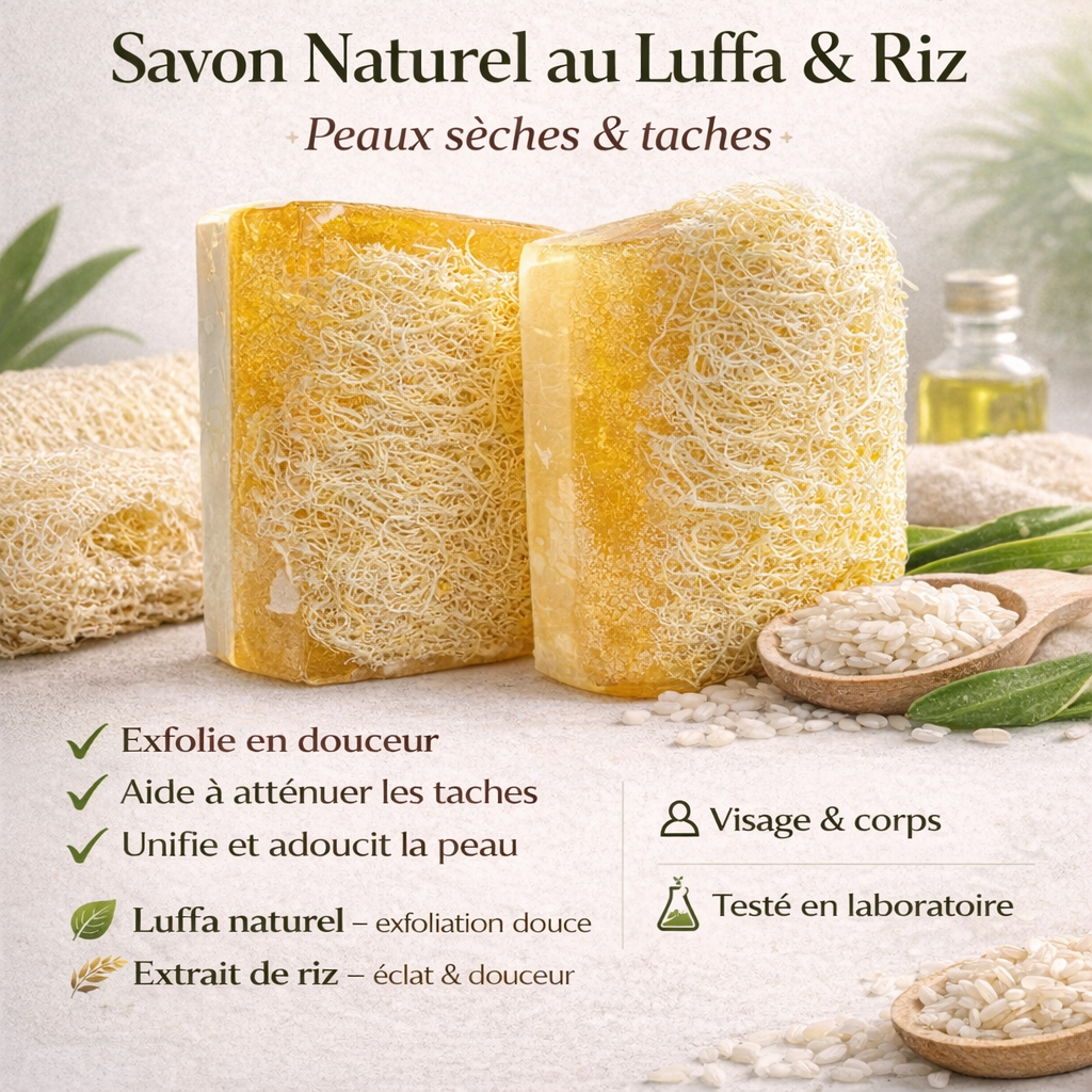 ✨ Savon Luffa à l’extrait de riz – Pour un teint fatigué ou terne. Exfolie en douceur, illumine et lisse la peau. Réveillez votre éclat naturel.